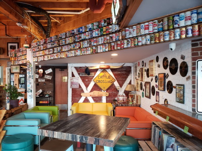 The old school beer can collection hovers over the colorful couches at Bridge Up Brewing in Sturgeon Bay.