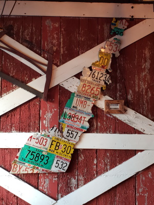 Old school Wisconsin license plates cut for a perfect Door Peninsula outline at Bridge Up Brewing, Sturgeon Bay