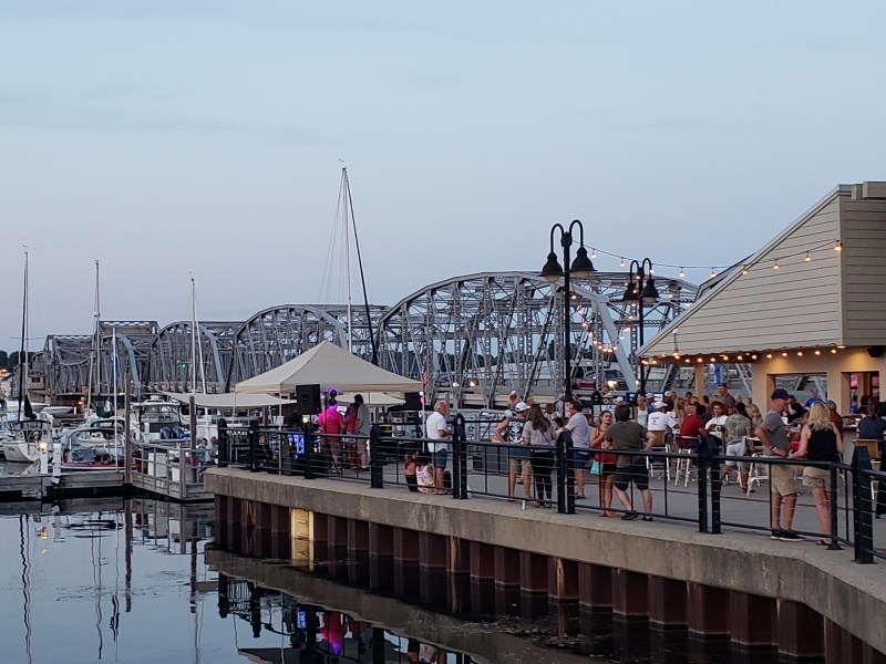 The historic Steel Bridge lurks behind the patio at Sonny’s and Bridge Up Brewing Company in Sturgeon Bay