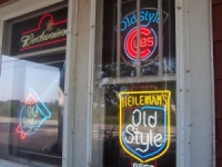 The Wooden Nickel, almost within sight of Illinois, features Wrigley Field’s beers. These signs change dramatically as you continue north on Highway 32.